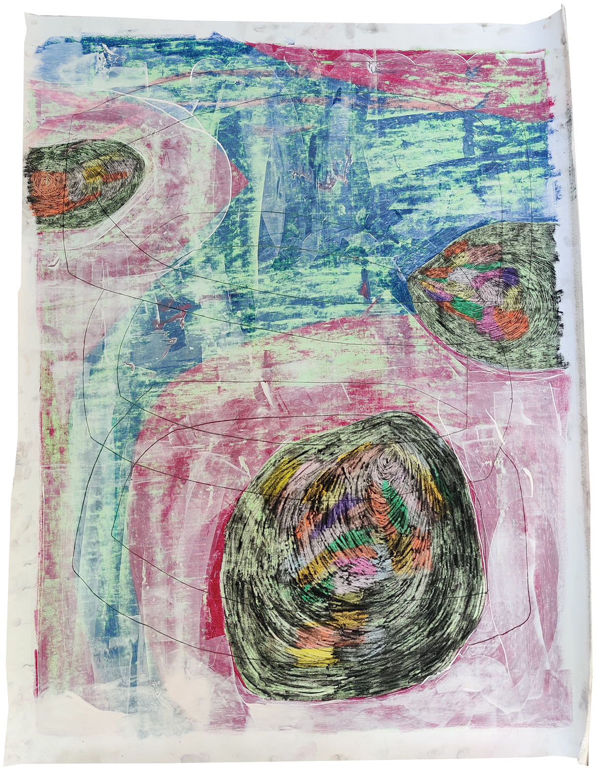 Acrylfarbe, Wachskreide und Bleistift auf Leinwand